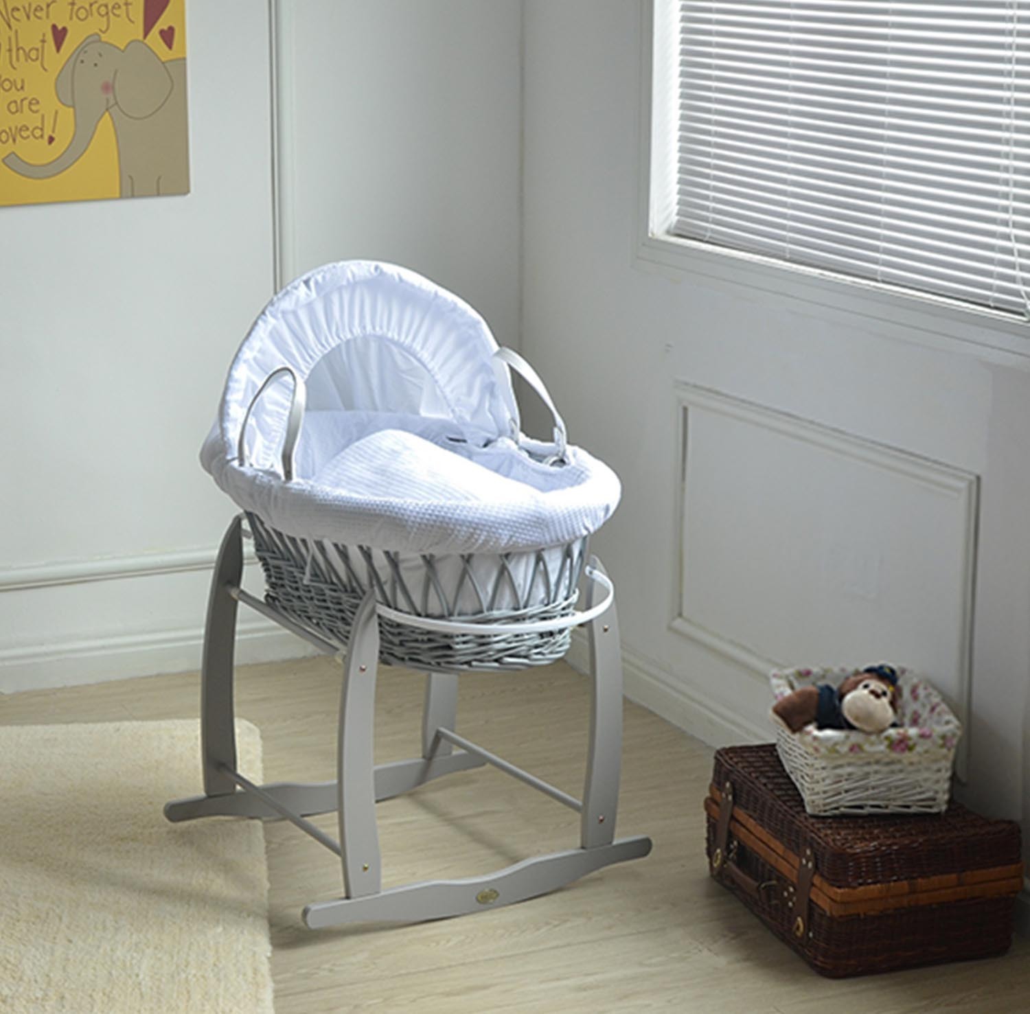 Deluxe Grey Wicker Moses Basket With Mattress,Bedding sets,and Rocking Stand