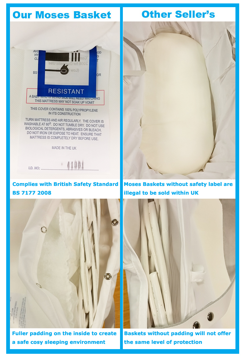 Classic grey wicker moses basket with matching handles and a thicker padding on the inside. (Complies with BS EN 1466:2004)