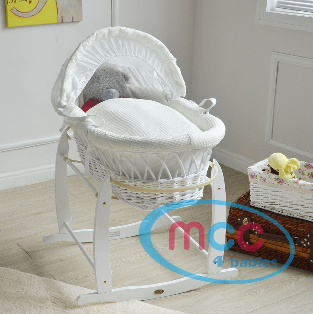 Deluxe White Wicker Moses Basket With Cream Cotton Dressing & Rocking Stand