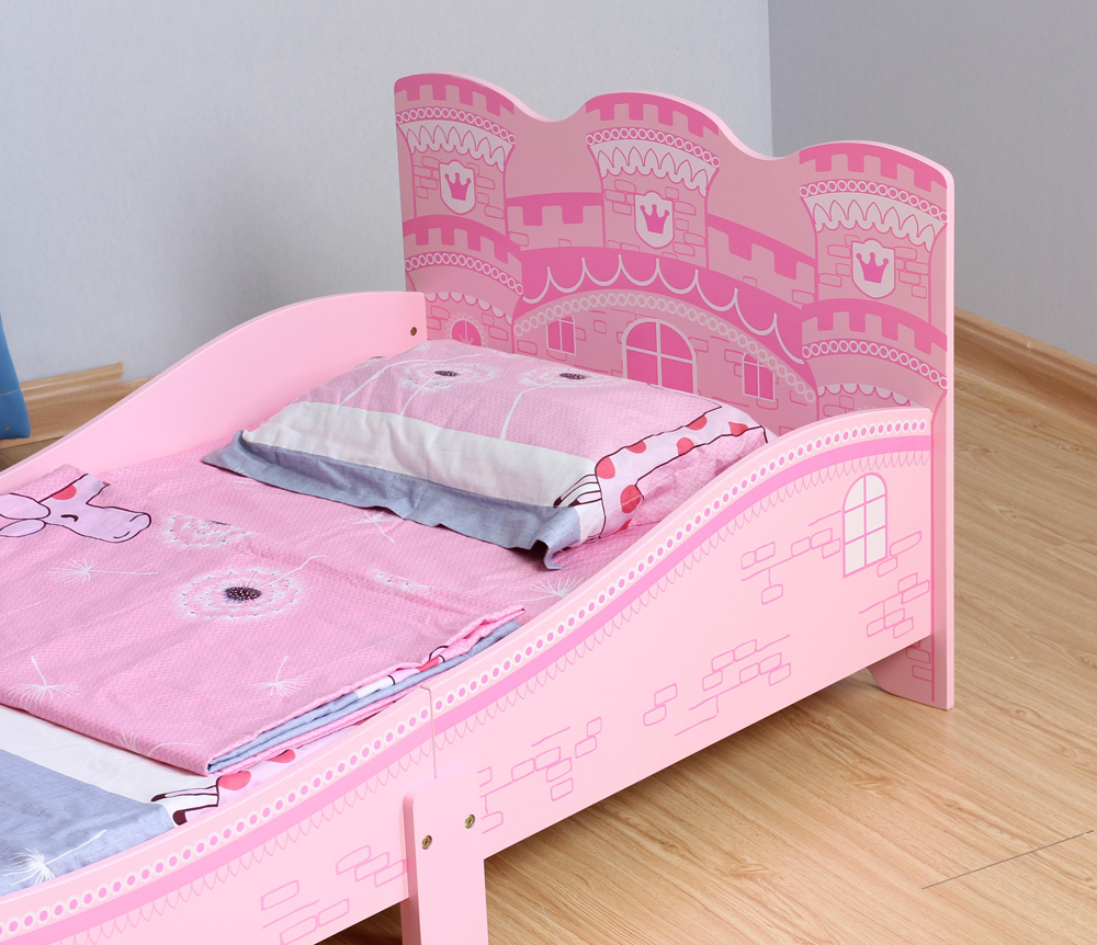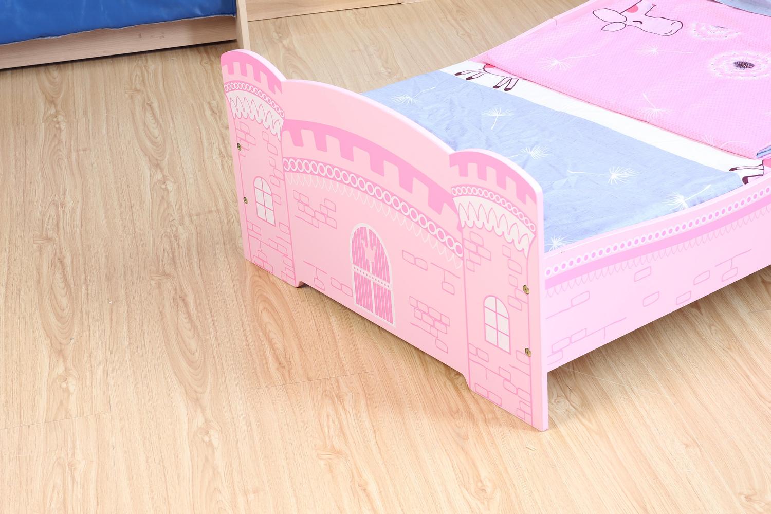 This toddler bed is tastefully designed with pink castle princess pattern. Designed low to the floor for your toddler's ease of getting in and out of bed bed and the sturdy solid MDF construction is sure to withstand even the most rambunctious toddler. The perfect transition for toddlers who have outgrown their cribs but are still too small for an adult bed.