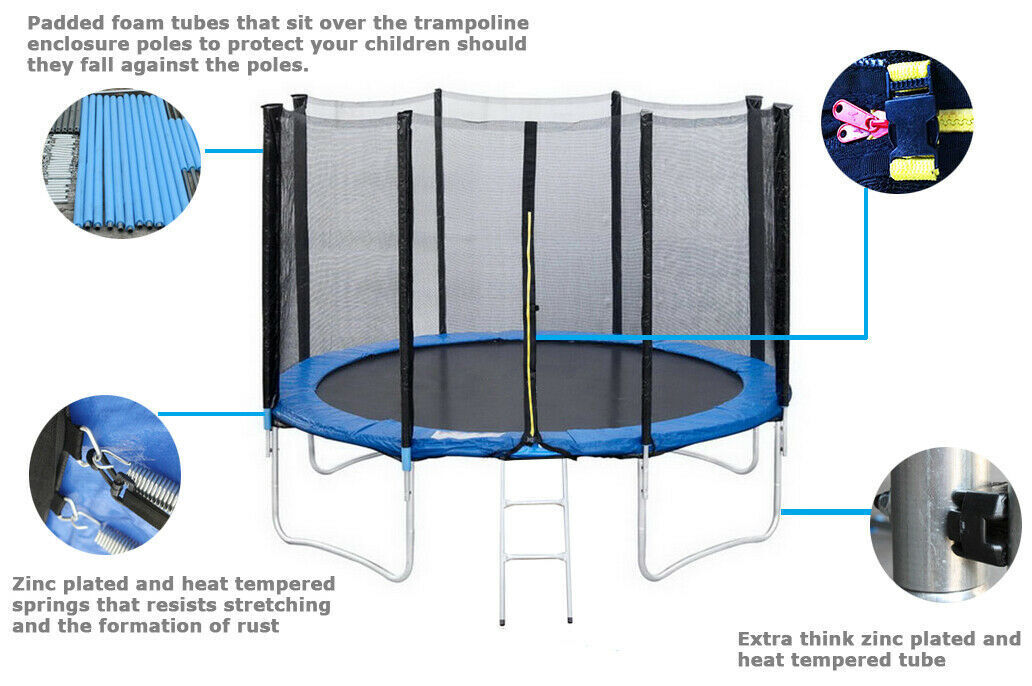 5 Size availability - 6ft 8ft 10ft 12ft 14ft Have the luxury of your own trampoline in the comfort of your house A 2 in 1 benefit of endless joy and healthy exercise for the kids 360° Mesh net covering for safety and security. Easy to follow instructions for a stress free assemble 2 step ladder for easy entry and exit Wide UV - Stabilised spring skirt for quality and durability High density springs Rust Resistant jumping mat Regular training develops physical skills and stimulates metabolism.